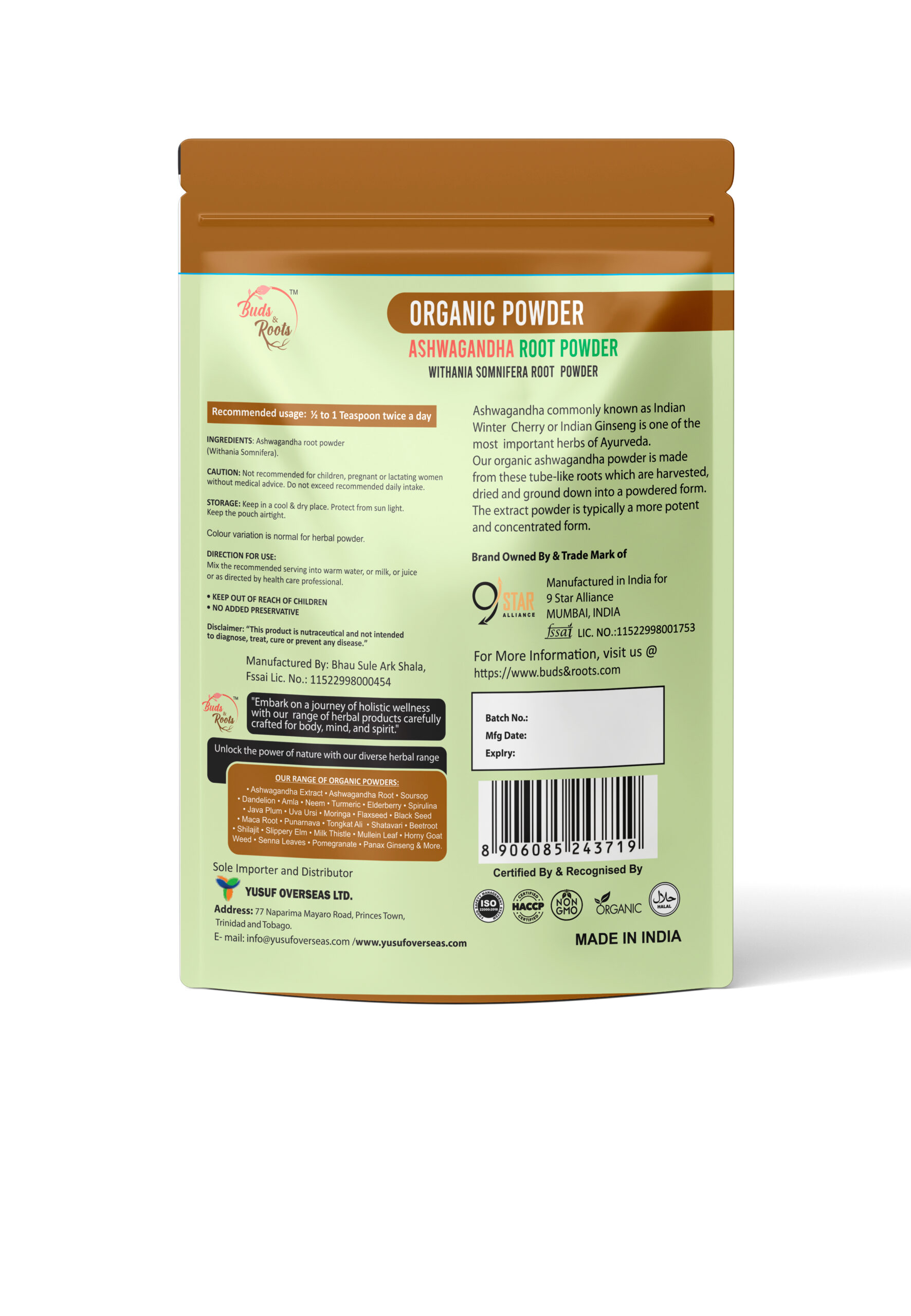 100% Organic Ashwagandha Root Powder: Pure root powder with no additives or preservatives.