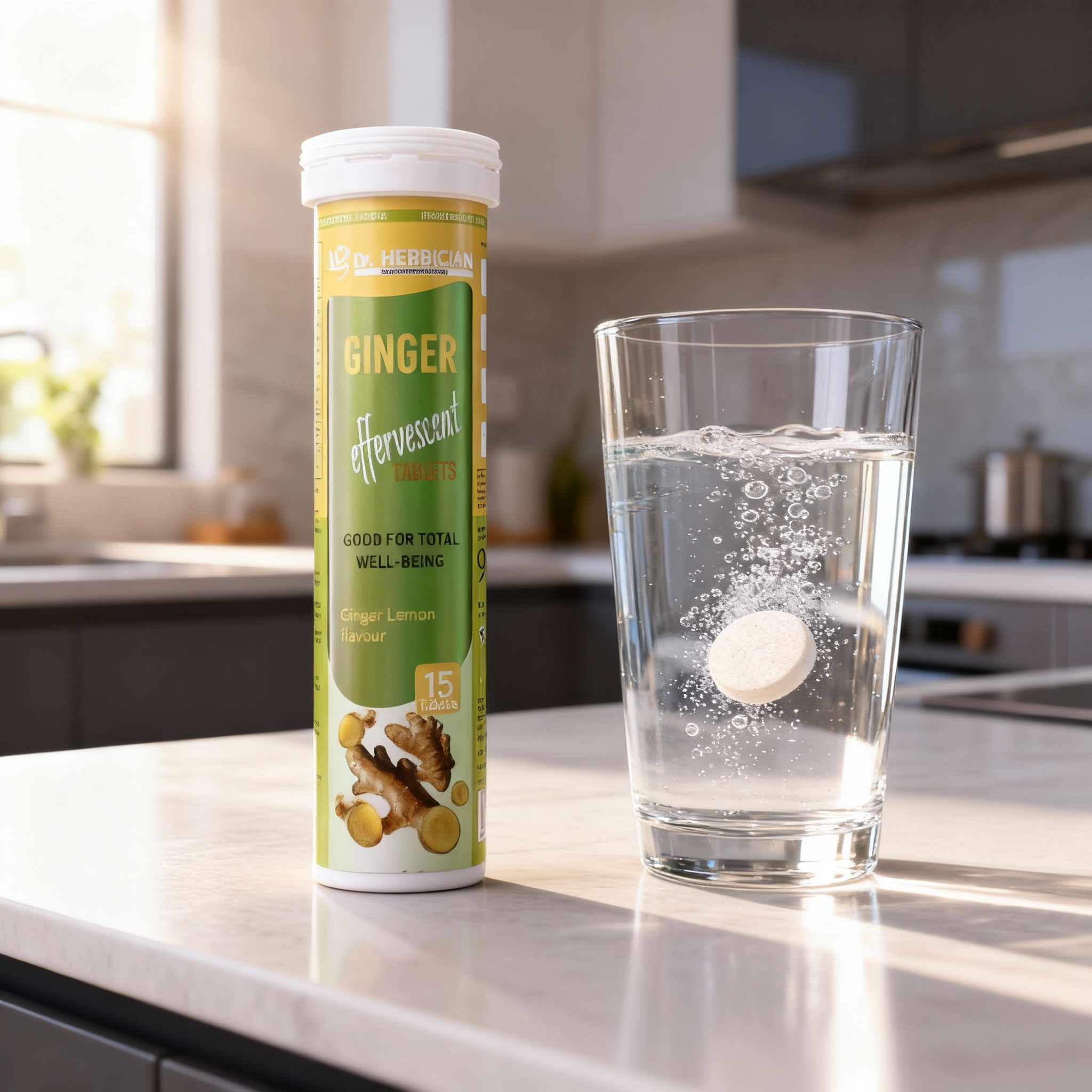 - Ginger and lemon-flavored effervescent tablets for digestion