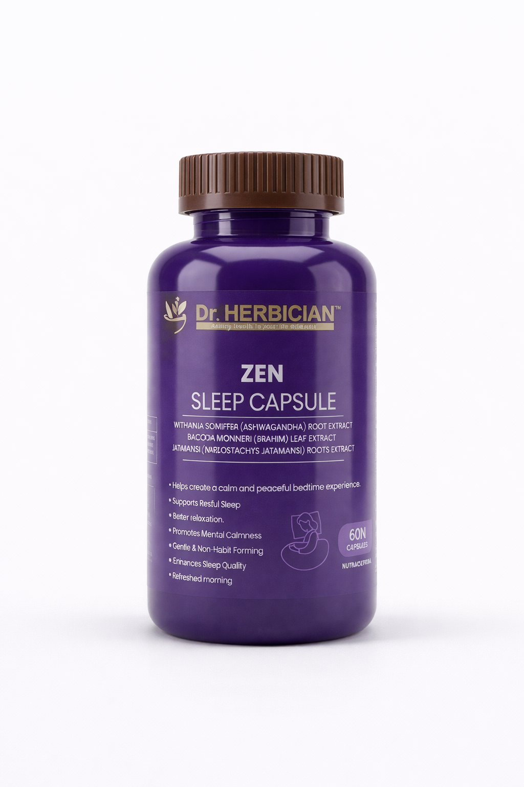 Dr. Herbician Zen Sleep Capsule is a natural herbal formulation designed to promote deep, restful sleep and support mental relaxation. Enriched with calming herbs, amino acids, and sleep-supporting nutrients, it helps ease stress, quiet the mind, and improve overall sleep quality. The formula works by supporting the body’s natural sleep cycle, helping you fall asleep faster and stay asleep longer without causing next-day grogginess. Ingredients commonly used in sleep supplements—such as GABA, L-theanine, and herbal extracts—are known to promote relaxation and support healthy sleep patterns. Ideal for individuals dealing with stress, irregular sleep patterns, or mental fatigue, these capsules provide a gentle and non-habit-forming way to restore natural sleep balance.