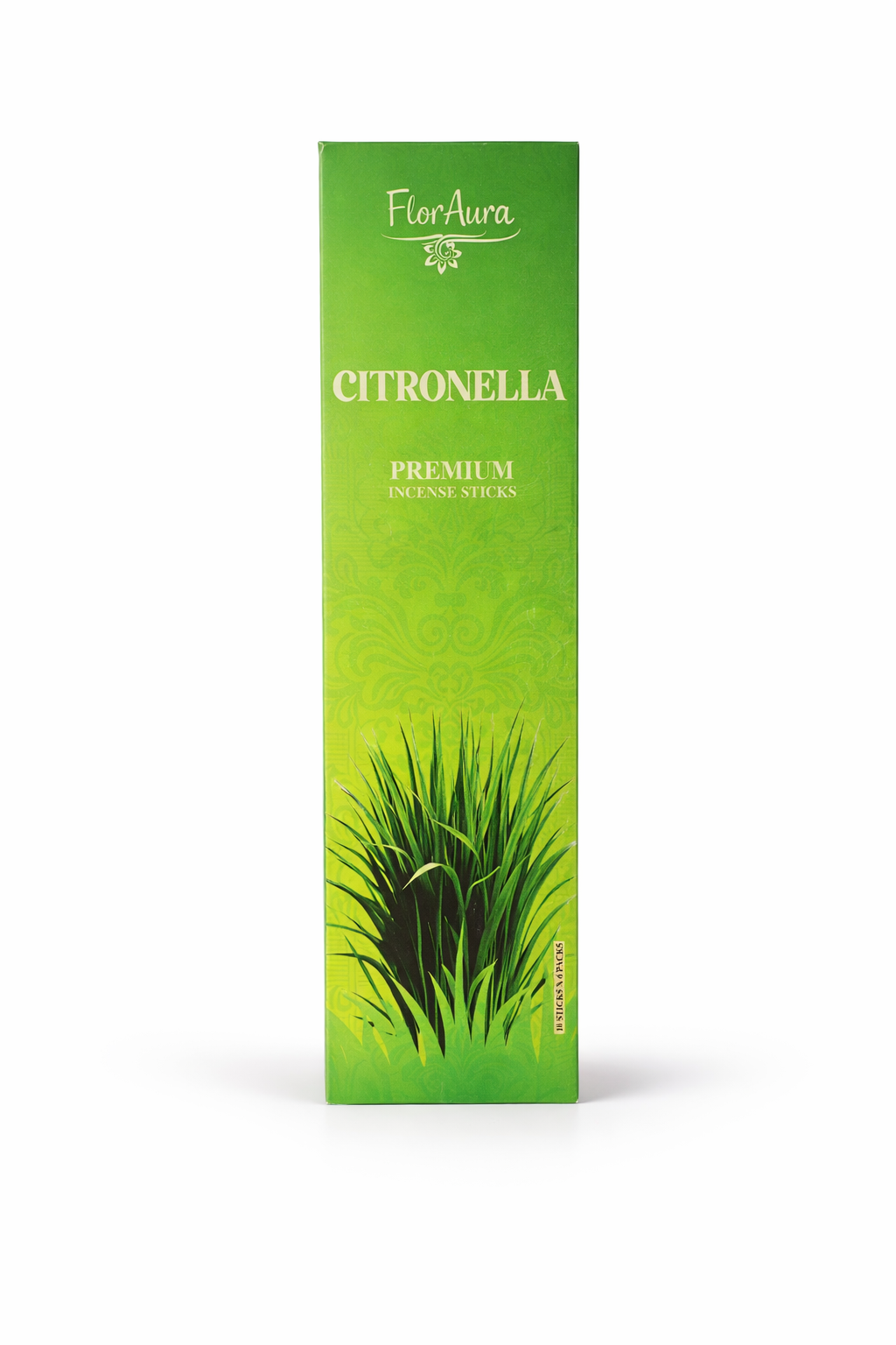Flor Aura Citronella Premium Incense Sticks are crafted with a fresh, citrusy aroma that revitalizes your surroundings while creating a clean and refreshing atmosphere. Known for its naturally uplifting scent, citronella helps brighten the mood and keep your space feeling light and energized. Ideal for daily use, these incense sticks are perfect for relaxing moments, outdoor settings, or refreshing your home with a crisp and pleasant fragrance.